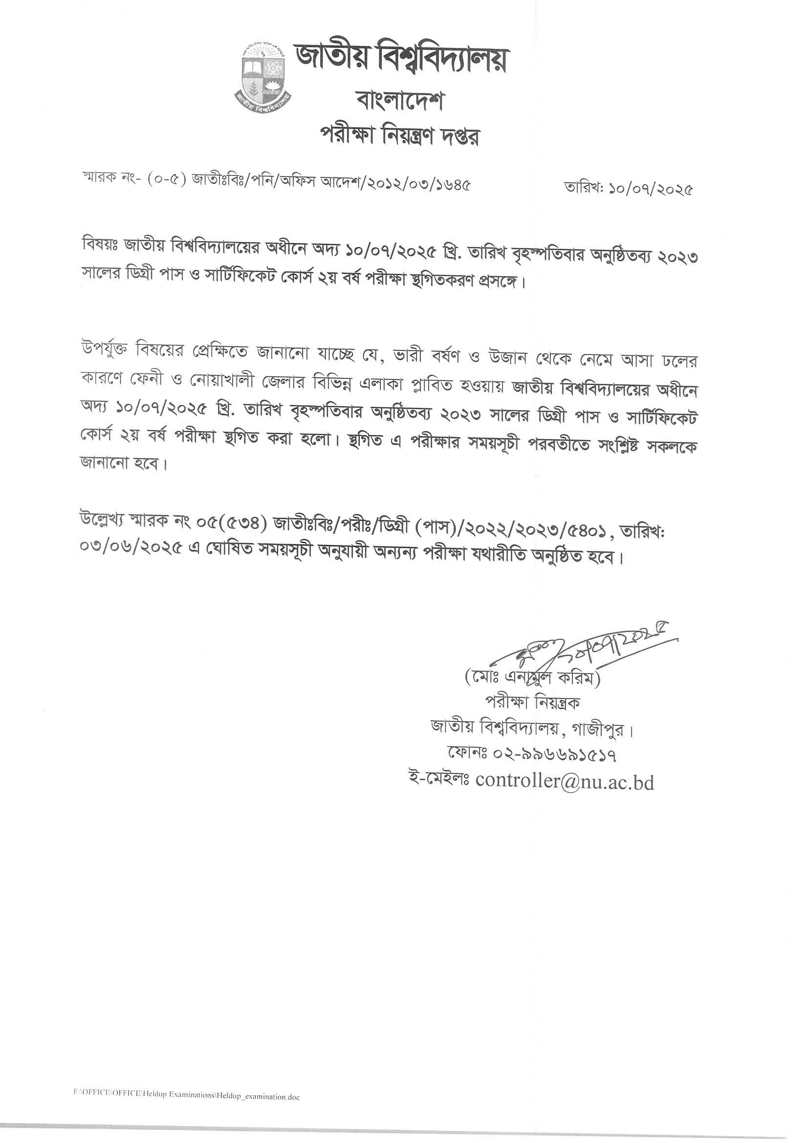 ২০২২ সালের ডিগ্রী পাস ও সার্টিফিকেট কোর্স ২য় বর্ষ পরীক্ষার সংশোধিত সময়সূচি |