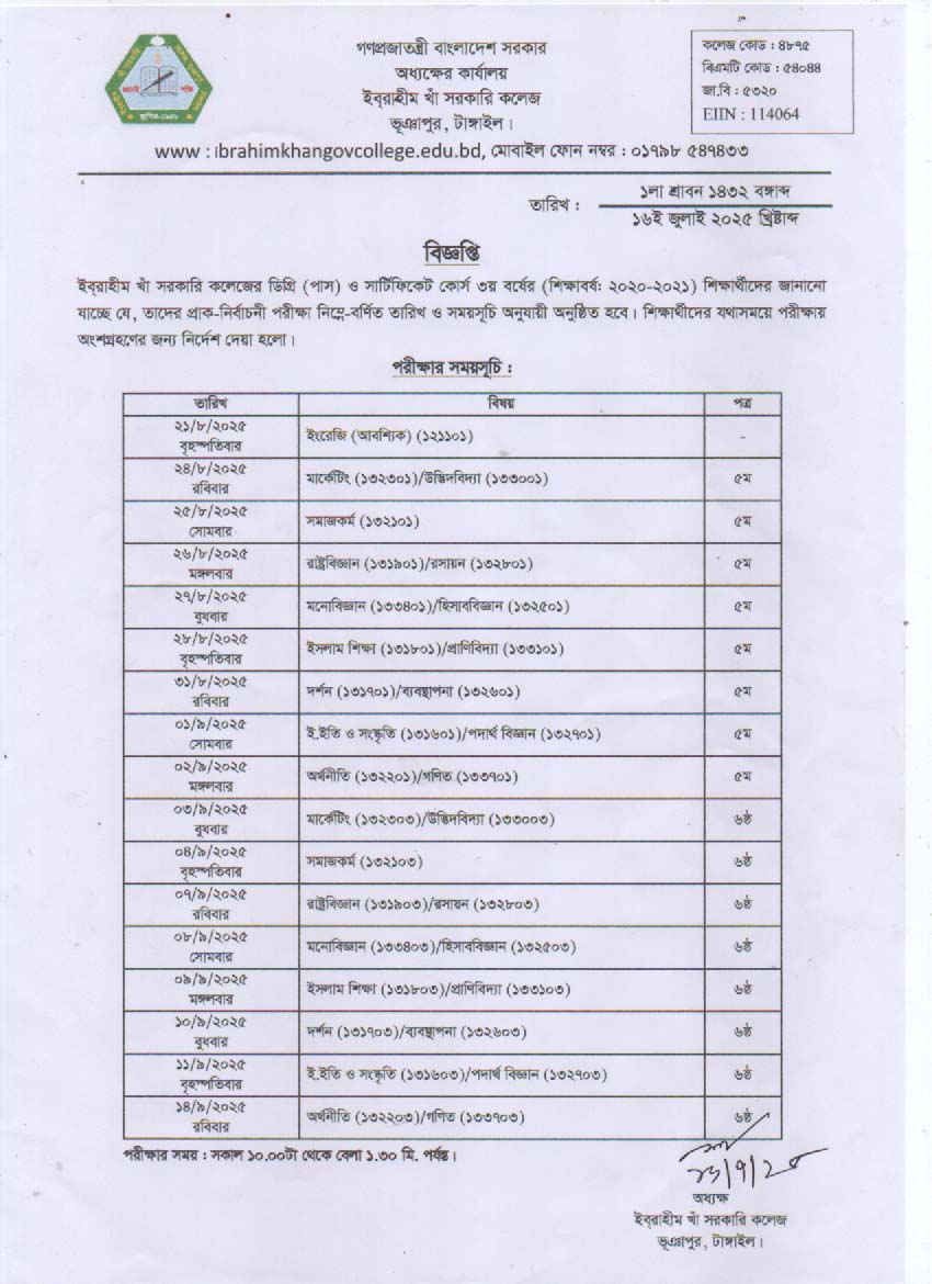২০২৪ সালের ডিগ্রি (পাস)ও সার্টিফিকেট কোর্স ২য় বর্ষ পরীক্ষার সময়সূচি |
